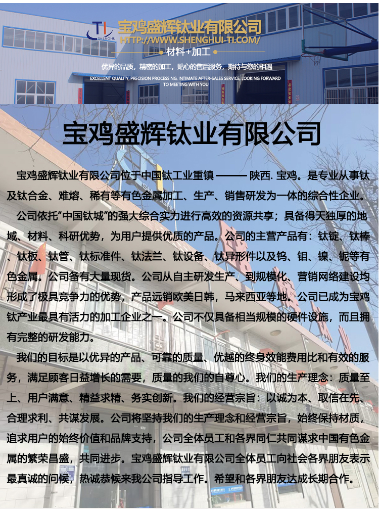 寶雞盛輝鈦業(yè)有限公司是一家主要從事鈦及鈦合金棒,鈦環(huán),鈦法蘭及鈦合金板材的高新技術企業(yè),公司提供鈦環(huán),鈦合金棒批發(fā),鈦環(huán)的生產(chǎn)工藝服務,以人為本,質(zhì)量取勝為宗旨:18791863990,18740375975