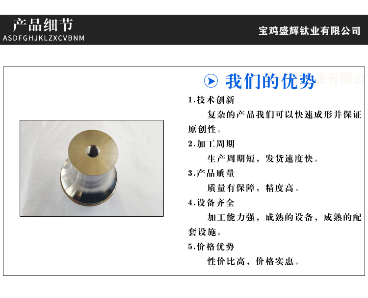 寶雞盛輝鈦業有限公司是一家主要從事鈦及鈦合金棒,鈦環,鈦法蘭及鈦合金板材的高新技術企業,公司提供鈦環,鈦合金棒批發,鈦環的生產工藝服務,以人為本,質量取勝為宗旨:18791863990,18740375975