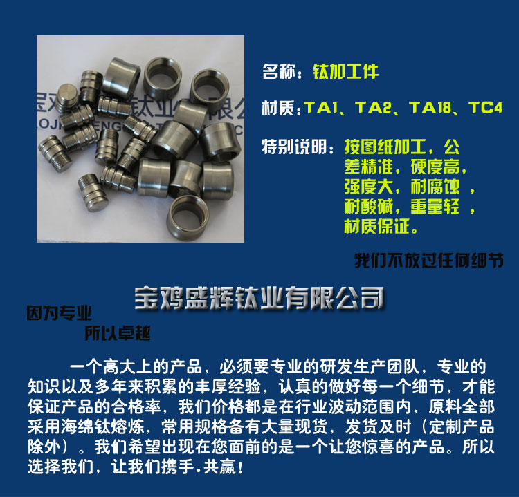 寶雞盛輝鈦業(yè)有限公司是一家主要從事鈦及鈦合金棒,鈦環(huán),鈦法蘭及鈦合金板材的高新技術企業(yè),公司提供鈦環(huán),鈦合金棒批發(fā),鈦環(huán)的生產(chǎn)工藝服務,以人為本,質量取勝為宗旨:18791863990,18740375975