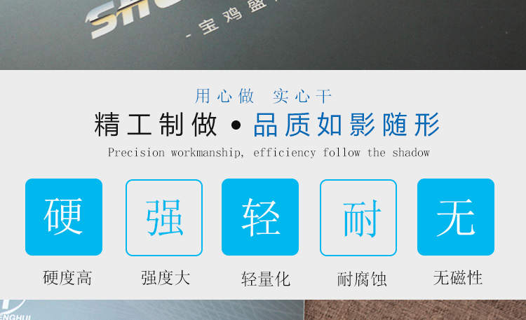 盛輝鈦業(yè)鈦產(chǎn)品采用優(yōu)質(zhì)的海綿鈦冶煉加工而成,本廠擁有數(shù)臺(tái)美國全進(jìn)口四軸哈斯、多臺(tái)數(shù)控車床以及普通車床、鋸床、焊接平臺(tái)等一系列先進(jìn)的設(shè)備,完善的配套設(shè)施,滿足不同產(chǎn)品的生產(chǎn)技術(shù)要求。產(chǎn)品無論是加工、操作、還是裝配、測(cè)試,每一道工序都實(shí)施嚴(yán)格的質(zhì)量管理,并符合環(huán)保、節(jié)能、節(jié)約資源的國家戰(zhàn)略,用料絕不含糊,提供高品質(zhì)的鈦材以及一流的售后服務(wù)。