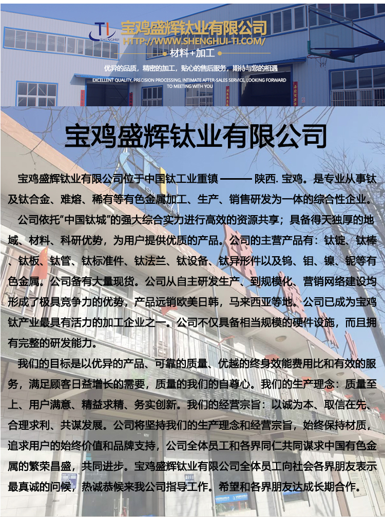 寶雞盛輝鈦業(yè)有限公司是一家主要從事鈦及鈦合金棒,鈦環(huán),鈦法蘭及鈦合金板材的高新技術(shù)企業(yè),公司提供鈦環(huán),鈦合金棒批發(fā),鈦環(huán)的生產(chǎn)工藝服務(wù),以人為本,質(zhì)量取勝為宗旨:18791863990,18740375975